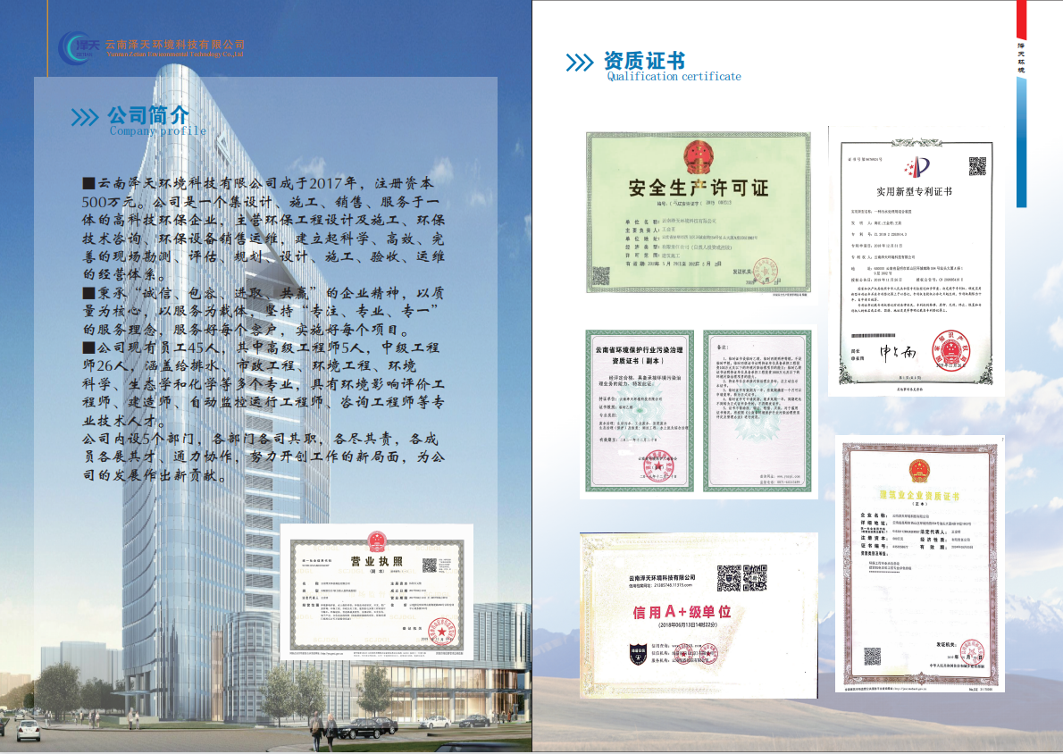 云南澤天環(huán)境科技有限公司成立于2017年,注冊(cè)資本500萬(wàn)元。公司是一個(gè)集設(shè)計(jì)、施工、銷售、服務(wù)于一體的高科技環(huán)保企業(yè),主營(yíng)環(huán)保工程設(shè)計(jì)及施工、環(huán)保技術(shù)咨詢、環(huán)保設(shè)備銷售運(yùn)維,建立起科學(xué)、高效、完善的現(xiàn)場(chǎng)勘測(cè)、評(píng)估、規(guī)劃、設(shè)計(jì)、施工、驗(yàn)收、運(yùn)維的經(jīng)營(yíng)體系。