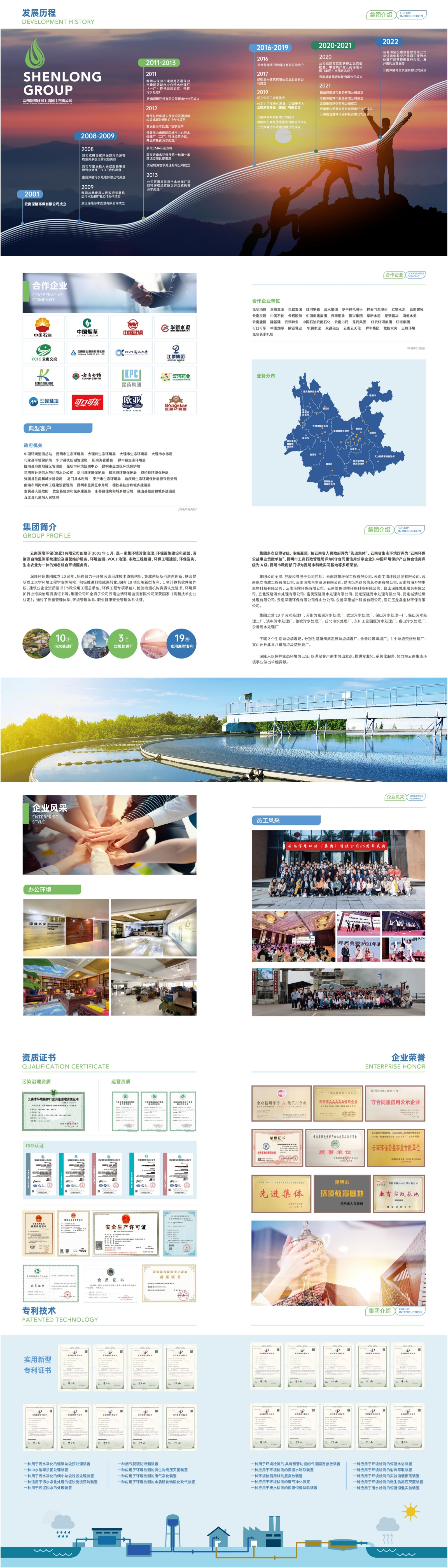 云南深隆環(huán)保(集團(tuán))有限公司2001年01月18日成立,公司注冊資本5000萬元,統(tǒng)一社會信用代碼:91530102719492536D。云南深隆環(huán)保(集團(tuán))有限公司是一家專門從事生態(tài)環(huán)境治理、環(huán)保設(shè)施運(yùn)營和環(huán)境監(jiān)測的綜合性環(huán)保科技公司。公司服務(wù)范圍包括污染源在線自動監(jiān)測服務(wù)、環(huán)境污水治理運(yùn)營服務(wù)收和技術(shù)服務(wù),服務(wù)內(nèi)容包括:廢水處理站托管運(yùn)維、污水廠擴(kuò)容提標(biāo)服務(wù)、污染源自動監(jiān)控系統(tǒng)運(yùn)維服務(wù)、污染源在線監(jiān)控聯(lián)網(wǎng)系統(tǒng)運(yùn)營服務(wù)、CEMS設(shè)備運(yùn)行維護(hù)服務(wù)、 VOCs自動監(jiān)控系統(tǒng)委托運(yùn)行維護(hù)技術(shù)服務(wù)等。公司下設(shè)多家分、子公司,擁有2個實(shí)驗室,運(yùn)營著14個污水處理廠、3個生活垃圾處理廠,公司已獲得省級表彰和獎勵10余次,擁有各類環(huán)境保護(hù)資質(zhì)。認(rèn)證項目涵蓋水和廢水、環(huán)境空氣和廢氣、土壤和固體廢物、噪聲和振動等類別,認(rèn)證項目200余項,認(rèn)證方法標(biāo)準(zhǔn)300余項。歷年累計扶貧及社會公益捐贈超過500萬元。公司兩污事業(yè)部(固廢/污水)負(fù)責(zé)運(yùn)營重點(diǎn)負(fù)責(zé)城鄉(xiāng)、市政工程,新建、擴(kuò)改建工程等項目污水、垃圾控制治理等方面領(lǐng)域。目前公司擁有實(shí)用新型專利10項,軟件著作權(quán)1項,企業(yè)標(biāo)準(zhǔn)1項。2022年公司獲得國家高新技術(shù)企業(yè)認(rèn)定,編號:GR202253000802,通過國家科技型中小企業(yè)認(rèn)定,編號:2022530102A0000726。云南深隆環(huán)保(集團(tuán))有限公司始終以市場為中心,以需求為導(dǎo)向,以人才為重點(diǎn),以利益為紐帶,著力在增強(qiáng)公司整體實(shí)力上下功夫。注重在激烈的市場競爭中,自我調(diào)整,主動適應(yīng),實(shí)現(xiàn)了以環(huán)保產(chǎn)業(yè)為主,市政基礎(chǔ)設(shè)施建設(shè)、生態(tài)環(huán)境修復(fù)、綜合環(huán)境整治、環(huán)境監(jiān)測、新能源技術(shù)推廣、城鄉(xiāng)供水、農(nóng)業(yè)科技等多業(yè)并舉,走出了一條"橫向加寬,縱向拉長"的內(nèi)延式增強(qiáng)和外延式擴(kuò)張的發(fā)展道路,實(shí)現(xiàn)了量的增長和質(zhì)的提升,屬于轉(zhuǎn)型升級成效明顯企業(yè)
